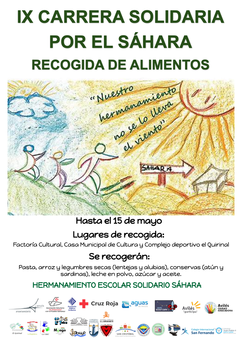 Además de los departamentos municipales implicados y todos los centros hermanados, colaboran de forma voluntaria: Atlética Avilesina; Cruz Roja Asamblea de Avilés; Grupo Scout Caph; Aguas Avilés, y el Taller de Teatro del Servicio de Juventud municipal.